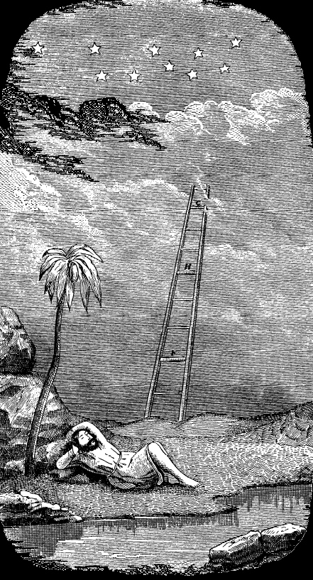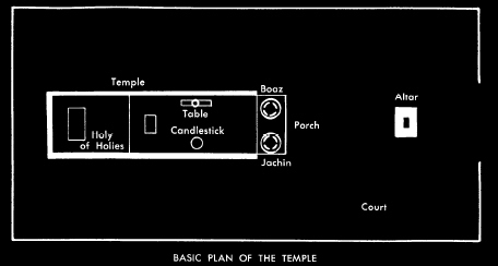 The apprentice enters the structure, symbolically, between the two columns, Jachin and Boaz, which are said to represent the two columns of Solomon's Temple (see II Chron. 3:15) and progresses by degrees toward perfection. All this happens under the All-Seeing Eye shown at the top of the figure, whom (they say) the sun, moon and stars obey and under whose watchful care even the comets perform their stupendous revolutions, (who) pervades the inmost recesses of the human heart, and who will reward us (Masons) according to our merits. (Lightfoot, page 33.) The reward supposedly comes after death releases him from this world and his soul progresses upwards toward heaven and perfection.