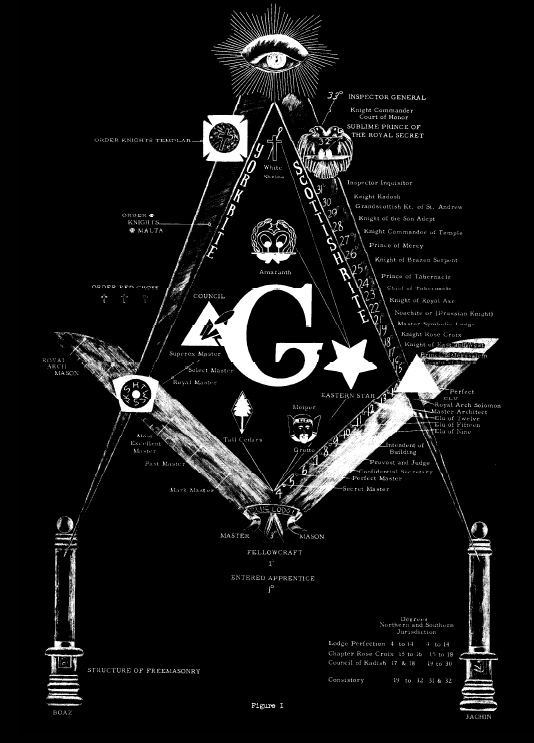 Figure 1 is the symbolic representation of Freemasonry in America. It is represented by a square and compass supported by two pillows, Jachin and Boaz. The illustration has been considered highly secret and was allowed only to Masons of high degree. It was given to me by a church member who had formerly been a Mason. Recently however, an article appeared in Lifemagazine (October 8, 1956, pages 104-122) in which the structure of Freemasonry was represented in similar manner. The fact that Masons decided to let the vulgar eye of the public see the different but accurate illustration, demonstrates their inconsistency.