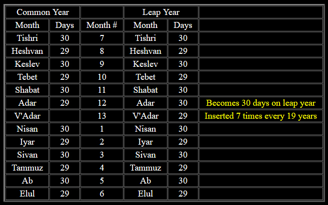 The months in a year alternate between 29 and 30 days, beginning with 30. This process of alternating between 29 and 30 days gives an average of 29 1/2 days. Below is a simple layout of the months as they occur, along with the days as they would fall in normal (common) years, followed by a leap year to the right. The month of Tishri is listed first since the start (new moon) of this month is the benchmark for calculating the entire year. This will be explained more fully below: