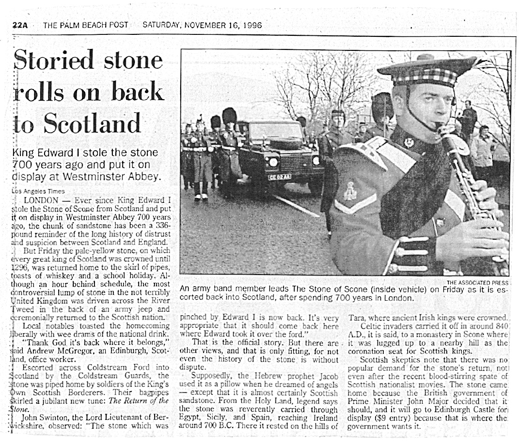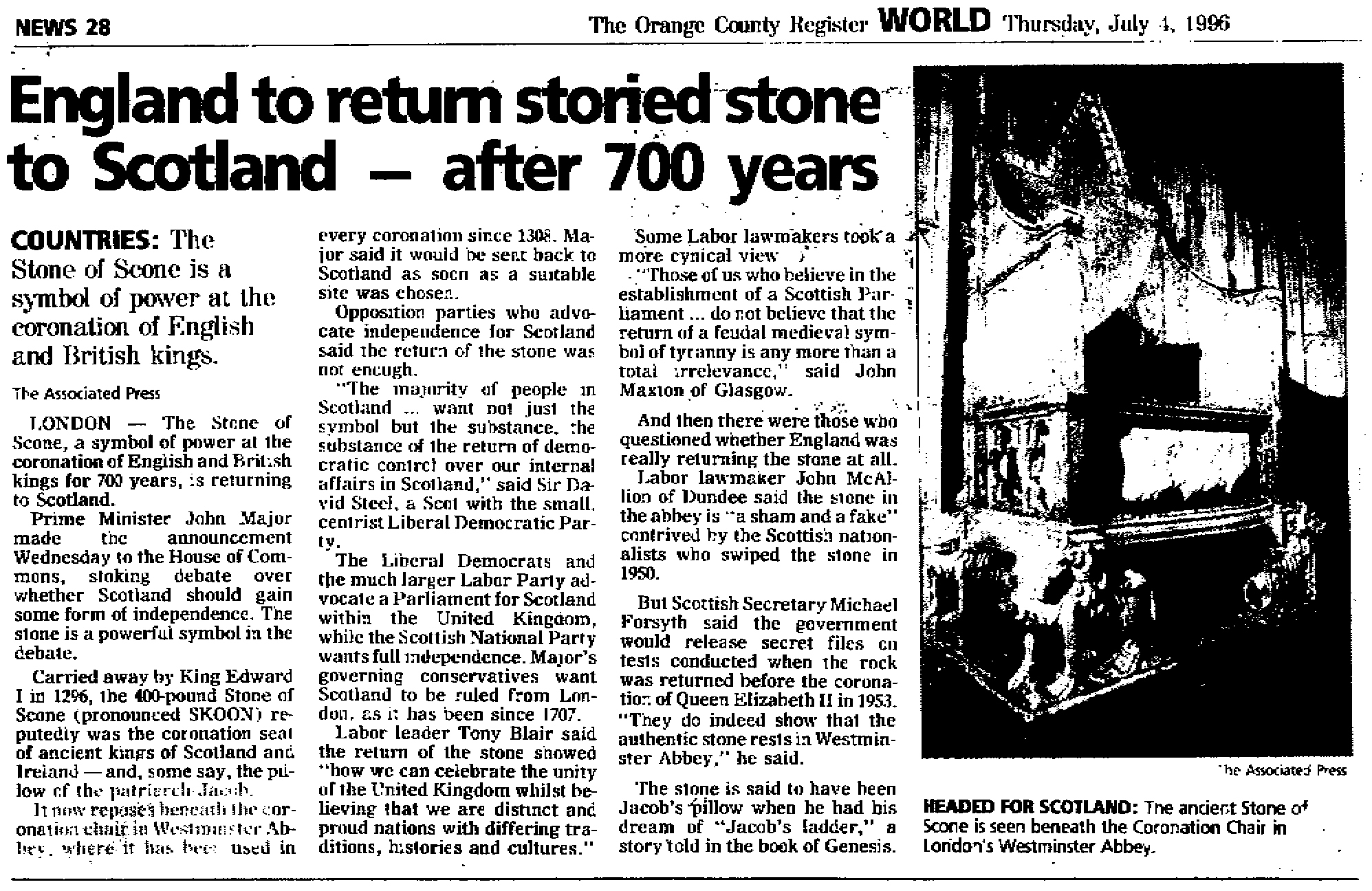 For some completely unknown reason, on the fast of 17 Tammuz 5756 which corresponded to Independence Day this year July 4th 1996, John Major the prime minister of England decided to return the Coronation stone to Scotland...