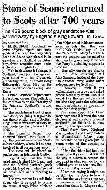 There is little, however, that is not in dispute about the Stone or shrouded in ancient history. There are alternate versions of its history. There are differences of opinion as to its weight. One source reported that it weighed 336 pounds and another said 458 pounds. The Stone appears to be camera shy, because I have found no pictures of it anywhere. One source implied chicanery regarding the Stone's ancient history, claiming that it was simply plain old Scottish sandstone. Another source laughingly admitted it was plain Scottish sandstone which the Scot Nationals who stole the Stone from the English in 1950 had returned in place of the original. I quote: However, canny Scots had almost certainly hidden the original stone and the one in London, a rather dull lump of plain sandstone, is not even a replica because the true stone was intricately carved. The stone was returned three months after its dis appearance, on the alter of Arbroath Abbey. It is no coincidence that it was at Arbroath that the Scots signed their Declaration of Independence in 1320 AD. According to the source quoted above, the true stone is being kept in a cavern by its rightful hereditary guardians )anyone we know ?) who will return it to Scotland when the time is right. Should I find out more about this family heirloom I will let you know in subsequent newsletters. I have not had a chance to read Nigel Trantor's book on the Stone of Destiny, but would like to see it or hear from anyone who has read it.