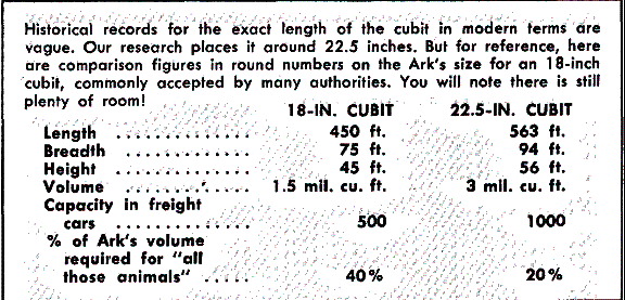 First consider the real size of the Ark. The length of the ark shall be three hundred cubits {563 ft.}, the breadth of it fifty cubits [94 ft.], and the height of it thirty cubits [56 ft.) (Genesis 6:15). That's ocean-liner size! Not until the nineteenth century was there built a vessel that exceeded its length. On displacement standards the Ark was a ship of 66,000 tons.